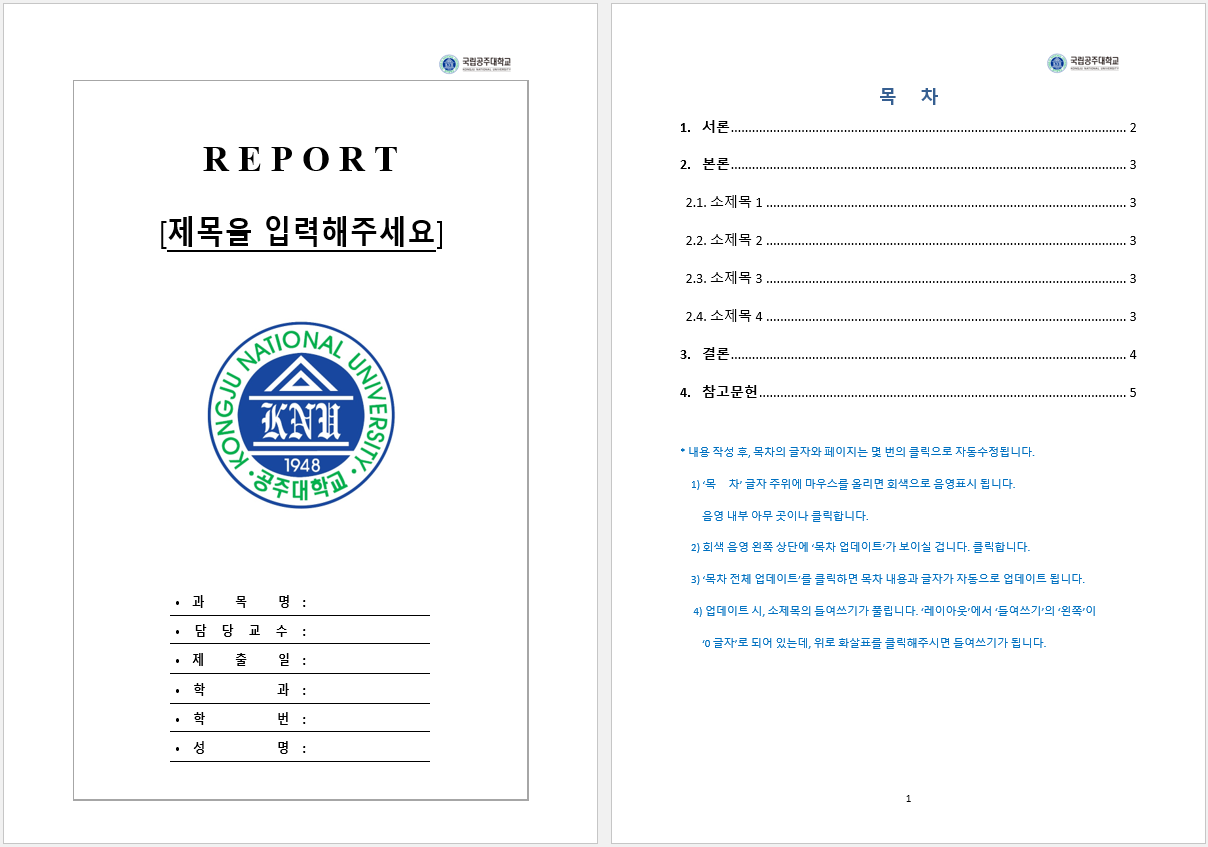 첫 번째는, 공주대 레포트 표지 양식 한글 버전입니다.