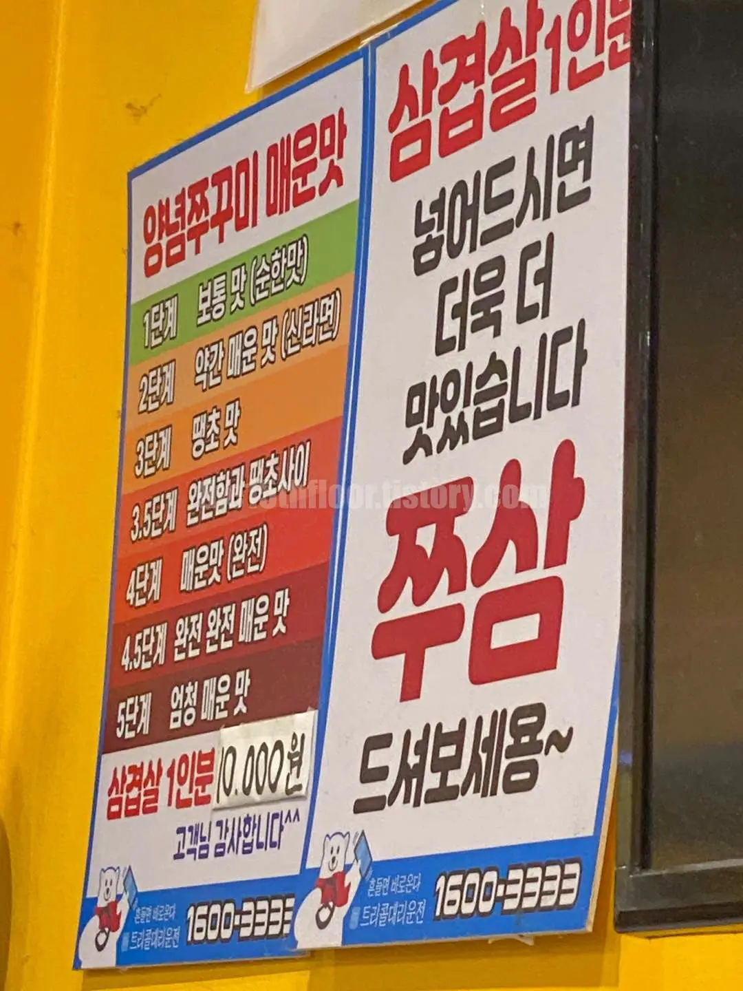 저는 보통 신라면은 특별히 맵다고 생각하지 않고 먹는 보통 정도의 매콤한 음식을 먹는 사람으로, '철판 양념 쭈꾸미' 2단계를 주문했는데 처음에는 특별히 맵다는 생각이 안 들다가 양념이 쫄아드니 조금 살짝 매콤하다는 느낌도 받았지만 너무 매워 못 먹겠다는 생각이 들 정도는 아니었습니다. 매울 때는 주어지는 콩나물과 메추리알을 까서 넣어 함께 먹고 또 특제 소스에 찍어 먹으면 매운맛이 많이 중화되므로 맵기 선택 시 참고 바랍니다. 저는 아예 맵지 않은 것보다 적당히 매콤하여 더 맛있었으며, 시중에 파는 소스나 첨가제, 조미료 등의 맛이 지배하는 그런 소스의 맛이 아니라서 중간에 질리지 않고 끝까지 맛있게 먹을 수 있었습니다. 특별히 같이 넣어서 먹는 콩나물의 아삭한 식감과 쭈꾸미의 쫄깃한 식감이 어우러져 정말 맛있게 먹었답니다!