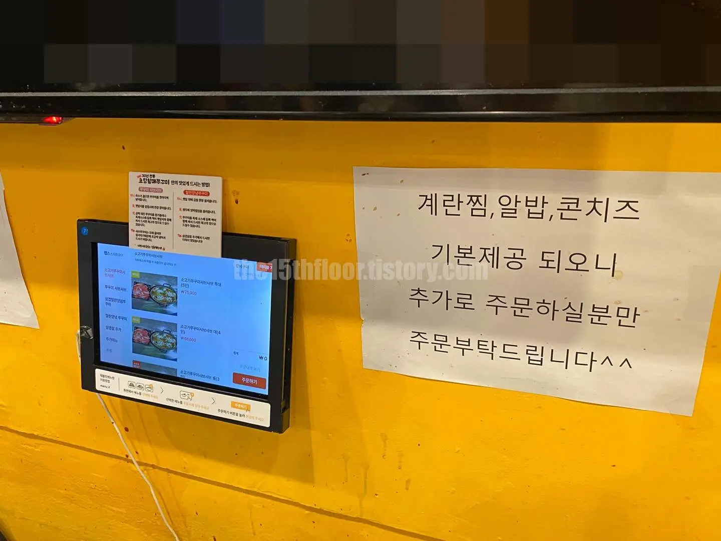 외관 및 내부입니다. 노란 간판에 '30년 전통'이 적혀있어 기대가 됩니다. 영업시간은 오전 11:30~새벽 2:00까지입니다. 주문은 자리에 착석 후 키오스크를 통해 주문할 수 있습니다. 평일 점심시간이 조금 지나 방문했는데, 아직도 좌석이 꽉 찬 모습입니다. 간판뿐 아니라 매장 내부도 노란 벽면으로 인테리어 되어있고요.